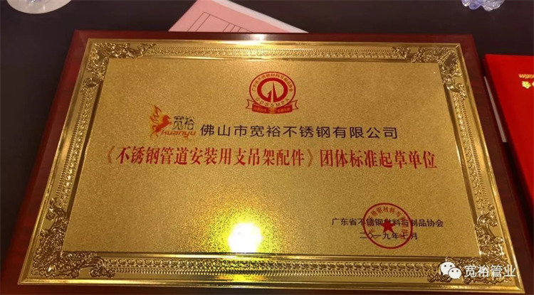 佛山市宽裕华体会hth·(体育)(中国)官方网站有限公司被授予《华体会hth·(体育)(中国)官方网站管道安装用支吊架配件》团体标准起草单位及起草人牌匾及证书。