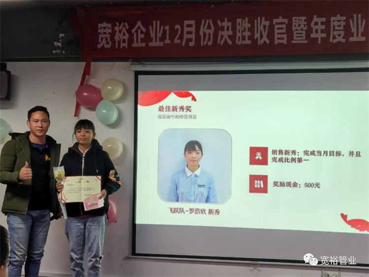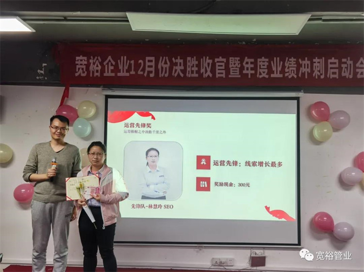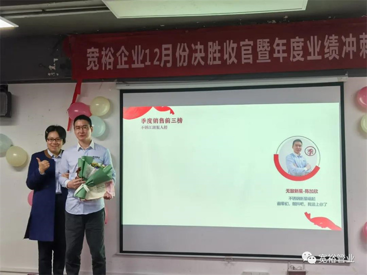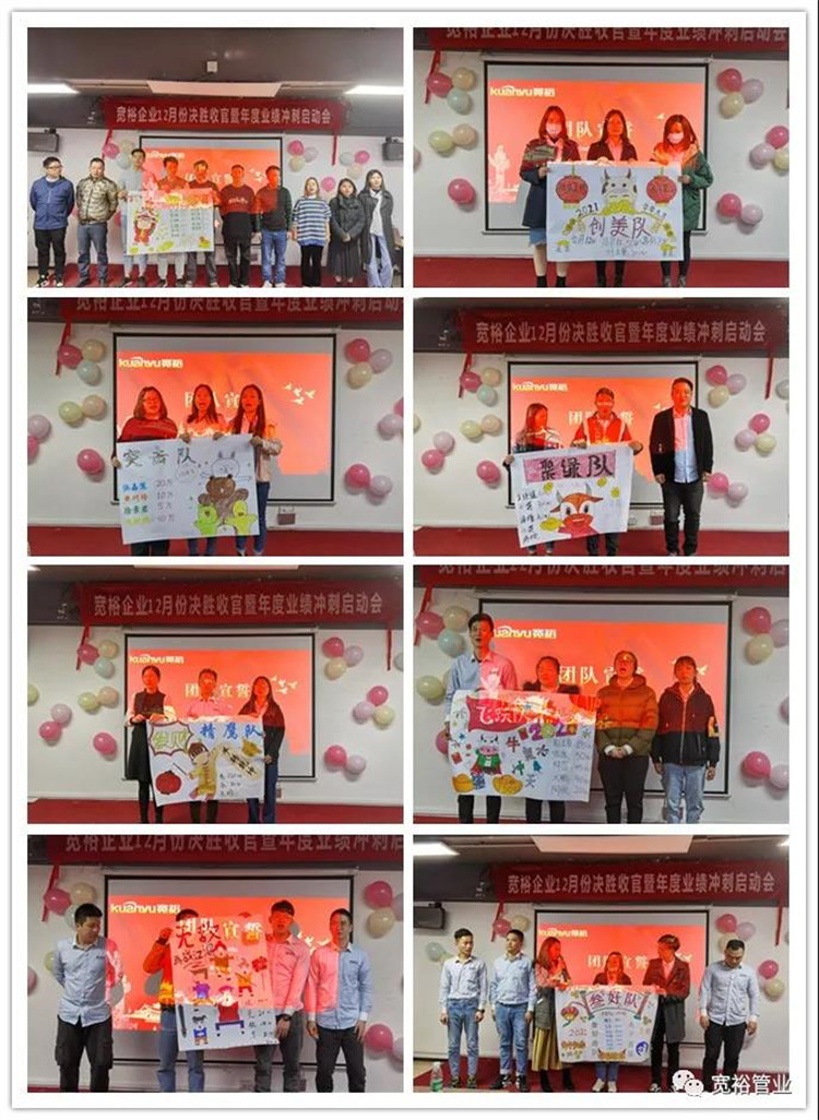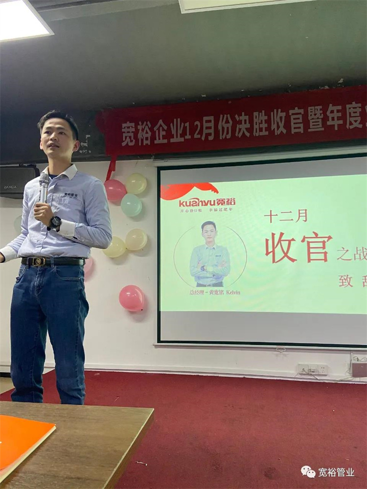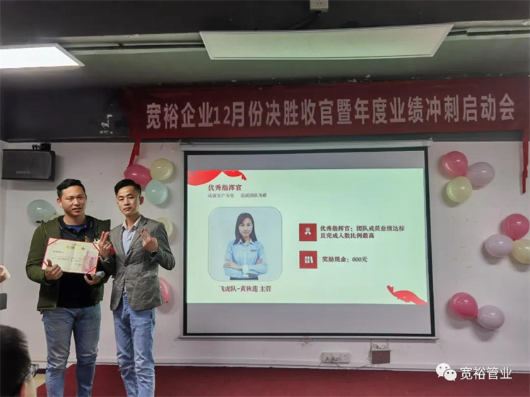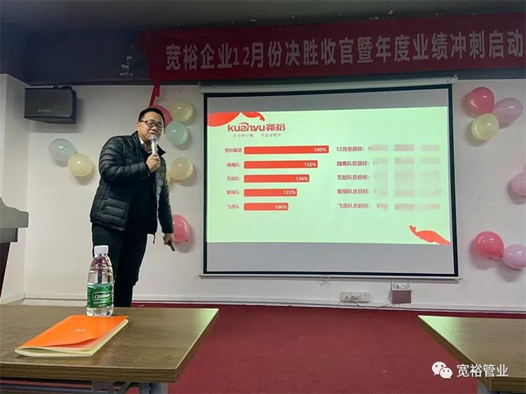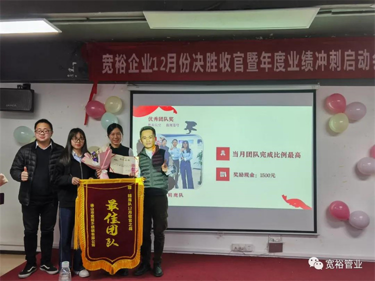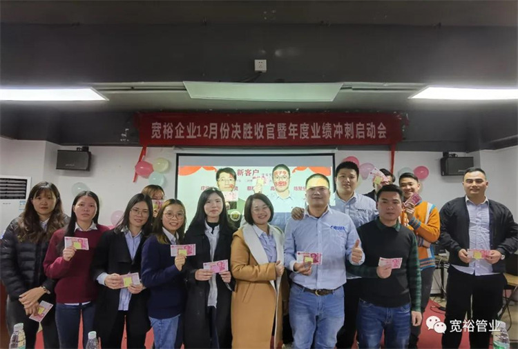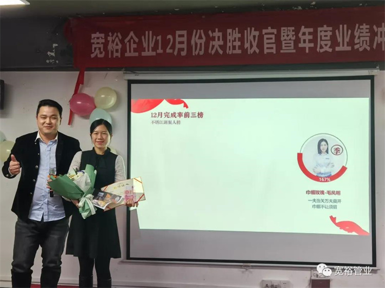 1月6日晚上,宽裕企业“快乐挣口粮,幸福过肥年”之12月收官之战总结及颁奖典礼在企业总部三楼会议室隆重举行!经过了一个月的奋战,经过一次启动及二次启动的叠加推进,每天早开会、晚总结,一个一个看似微不足道的动作,全都为了指向最终目标的胜利实现!宽裕的全体战士们最终以100%完成冲刺任务的彪炳战绩为2020年画上了圆满的句号!在此,小编仅代表宽裕企业感谢所有英勇奋战的战士们!感谢台前幕后所有的伙伴们共同推动了本次收官之战的胜利!1月6日,我们胜利会师啦!