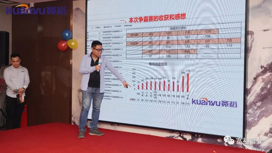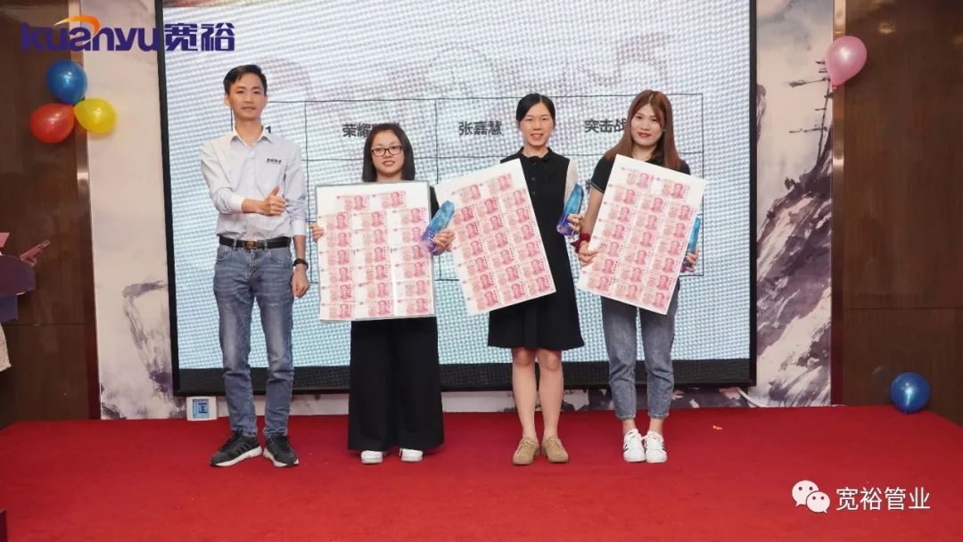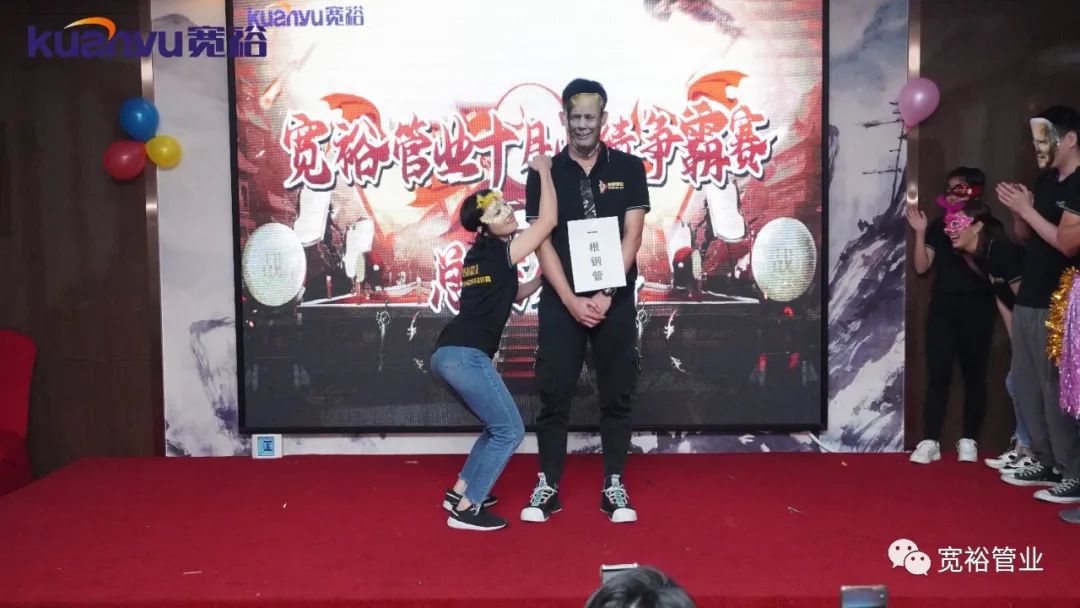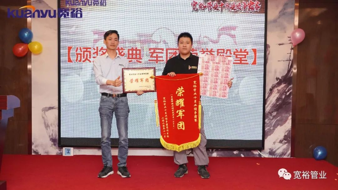 2020年11月10日下午3点,宽裕管业十月业绩争霸赛颁奖盛典在维也纳珠江厅举行,为本次争霸赛表现优异的同事们进行嘉奖,这次争霸赛中英雄辈出,涌现了百万英雄、五十万旗手、亮剑英雄、明日之星等。