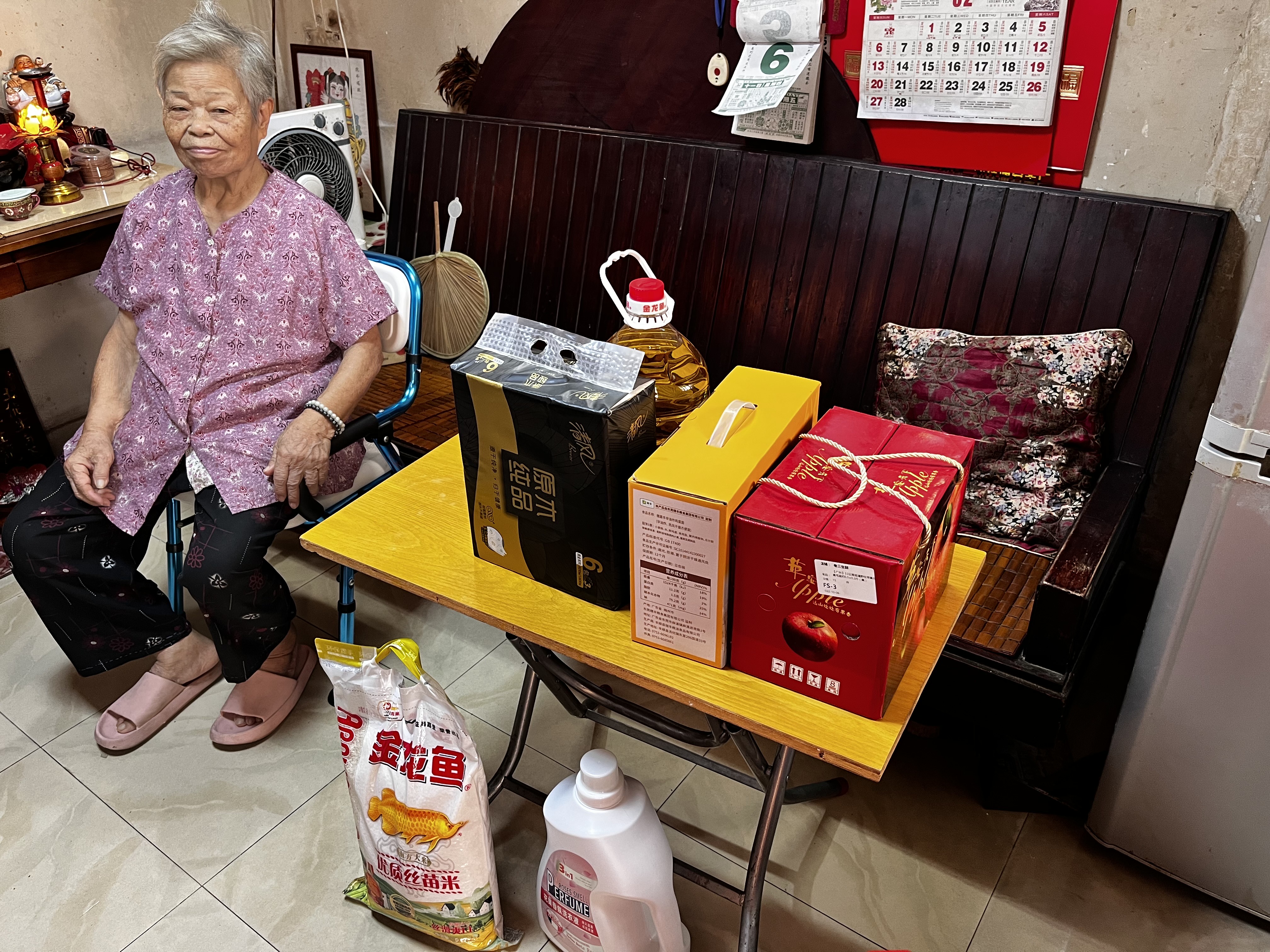 精心挑选的柴米油盐、新鲜可口的营养果蔬、日常使用的清洁纸巾、一年分量的洗衣液……每一样都精挑细选,为老人生活增添亮丽色彩。
