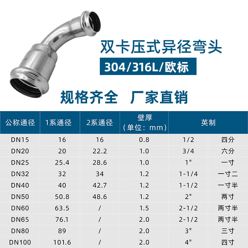 双卡压式异径弯头符合国标I系、国标II系和欧标。